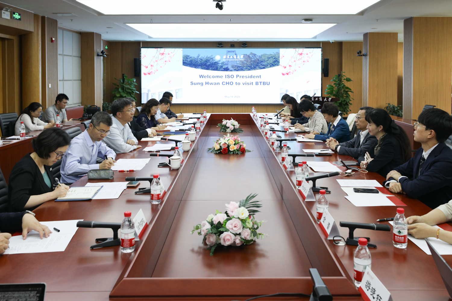 5月15日下午,國際標準化組織(ISO)主席曹誠煥一行在國家市場監督管理總局標準創新司副司長李玉冰陪同下訪問我校。學校黨委副書記、校長郭建華在阜成路校區會見了曹誠煥主席一行。會見由黨委常委、副校長毛新述主持。