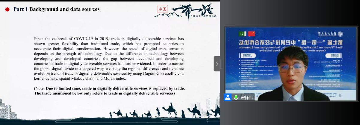 “一帶一路”青年論壇環節由我校國際經管學院數字經濟系副主任韓璐主持。由我校經濟學院國際貿易系主任郭志超、國際經管學院數字經濟系副主任張璐,廣東外語外貿大學經濟貿易學院副教授、高被引學者丹尼斯、寶雞文理學院副教授穆罕穆德 ? 阿韋斯 ? 俾路支、巴基斯坦費薩拉巴德政府學院助理教授穆罕穆德 ? 瓦薩姆 ? 巴里等擔任專家委員會成員。10位國內外學生就“一帶一路”國際合作主題展示了自己的研究成果。專家委員會對論文進行了點評及打分,最終評選出一等獎1名,二等獎2名,三等獎7名。專家委員會鼓勵中巴青年積極開展各領域交流合作,增進友誼。