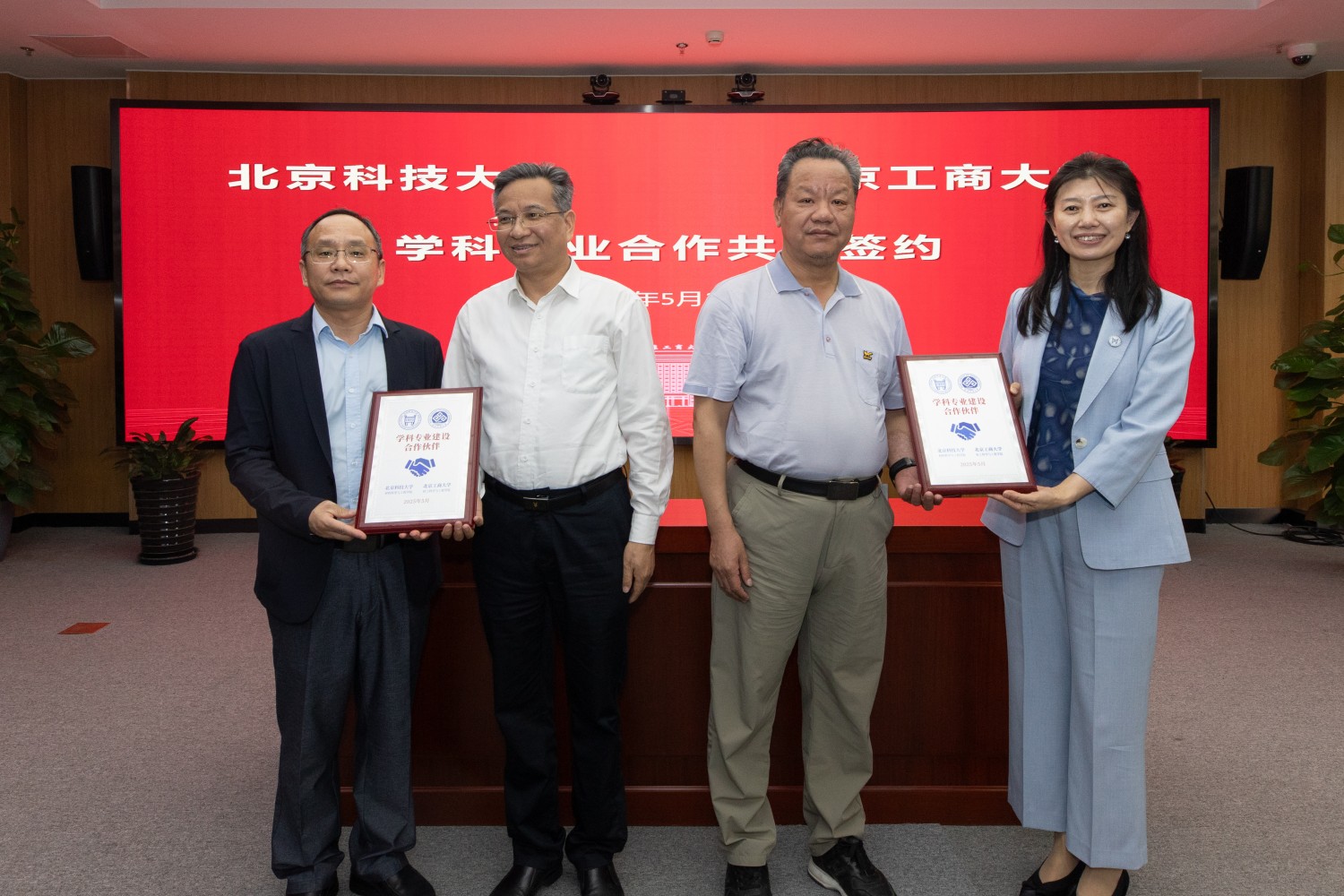 北京科技大學(xué)材料科學(xué)與工程學(xué)院張秋曼書記和我校輕工科學(xué)與工程學(xué)院翁云宣執(zhí)行院長簽約;北京科技大學(xué)彭慶紅副校長和我校鄭文紅副校長為雙方頒發(fā)簽約紀(jì)念牌。