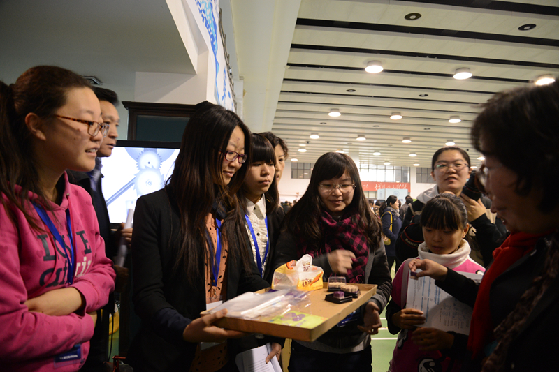 材料與機械工程學院的“摳門狼”團隊憑借大膽創意、精確的結構設計及以人為本的設計理念,制作出的節能電動車憑借其安全、舒適、方便、節能的特性備受關注。食品學院的百合紫薯山藥糕從營養口味上進行創新,滿足消費者日益豐富的需求,突出了學校食品學科特色。藝術與傳媒學院學生團隊通過展板展示的創意作品設計模型圖,向大家宣傳了廢物利用的環保理念:創意設計“saving”是一個回型衣架,它不僅可以節省掛衣服的空間,還可以快速將衣服放進衣櫥,節省時間;“finding”則是一個在夜間可以迅速找到拖鞋的設計,為人們提供了便利;《復活》是同學們將廢舊的啤酒瓶蓋與軟磁鐵相結合而成的冰箱貼。