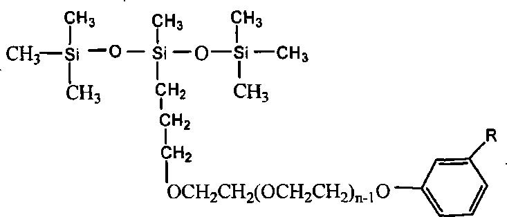 其中,R代表C15H31,n為2-20的整數。本發明提供了上述的含三硅氧烷的腰果酚醚型表面活性劑的制備方法。其制備方法是由氯丙基三硅氧烷與腰果酚聚氧乙烯醚反應,然后分離純化 可得到含三硅氧烷的腰果酚醚型表面活性劑。本發明含三硅氧烷的腰果酚醚型表面活性劑同時具有含硅表面活性劑和腰果酚表面活性劑的性能特點,具有溶解性好,皮膚刺激性小,生物降解性優良;并能與其它表面活性劑配伍性好;可以得到不同環氧乙烷加成數的含三硅氧烷的腰果酚醚型表面活性劑,可做成乳化劑、潤濕劑、增溶劑、洗滌劑等。