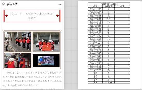 2月7日,所有在外學(xué)子收到了來(lái)自組委會(huì)的一條群消息:“各位在外學(xué)子:大家好!截止今天,石柱在外學(xué)子志愿服務(wù)隊(duì)發(fā)起的抗擊疫情捐款倡議共收到53人捐款,總計(jì)2525.66元。所收款項(xiàng)我們將全部移交給石柱土家族自治縣紅十字會(huì),捐款詳情也將在官方公眾號(hào)上進(jìn)行公示。謝謝大家!”