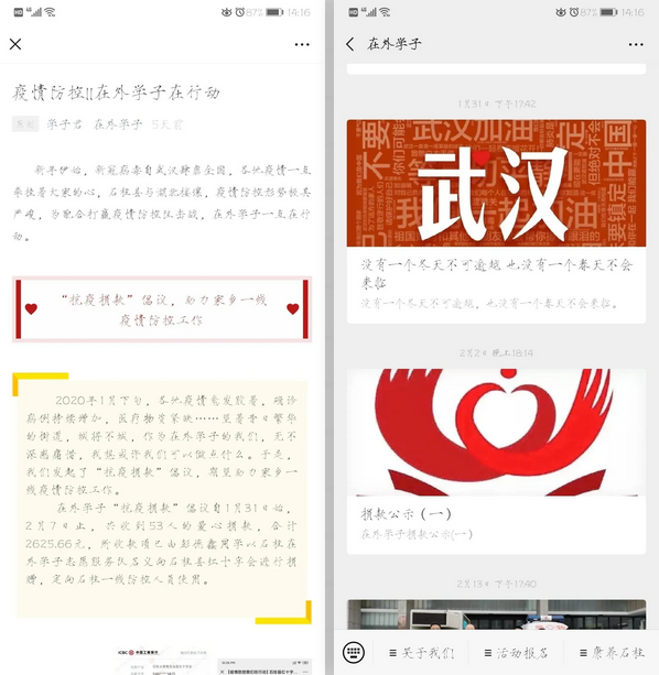 1月31日下午5點(diǎn),我與組委會(huì)共同商討后,我通過(guò)在外學(xué)子官方公眾號(hào)推送了一篇題為《沒(méi)有一個(gè)冬天不可逾越,也沒(méi)有一個(gè)春天不會(huì)來(lái)臨》的文章,以石柱在外學(xué)子志愿服務(wù)隊(duì)的名義發(fā)出倡議,希望各位石柱籍在外學(xué)子能夠奉獻(xiàn)自己的一份心意,支援家鄉(xiāng)、支援武漢、支援全國(guó)更好地打贏這場(chǎng)疫情攻堅(jiān)戰(zhàn)。