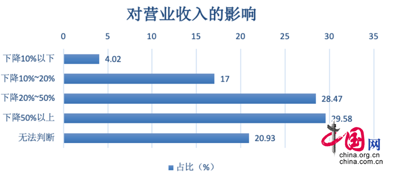 春節期間原是全年消費旺季,但是由于春節之前全國各地開始嚴格管控聚餐、大型活動等,導致非疫情相關企業無法正常開工,營業收入大量下降。例如房地產企業,受到疫情影響,房地產企業全部不允許進行樓盤銷售活動,房地產交易量持續走低,進而影響房價整體下降,房企抵押物不足,融資難度加大;其他零售業、服務行業等,由于疫情傳播速度快,春節假期大部分人都“閉戶在家”休息,較少會選擇外出購物、聚餐、旅游,因此對該類行業的經營造成極大沖擊。據清華、北大聯合調研995家中小企業對此次疫情的評估與看法,29.58%的企業估計疫情導致2020年營業收入下降幅度超50%,28.47%的企業預計營業收入下降20%-50%,合計58.05%的企業2020年營業收入下降20%以上。