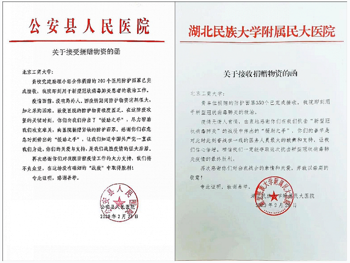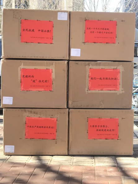 “中國共產黨始終在你身邊!”“工商學子齊努力,共助荊楚戰(zhàn)疫情!”“黨旗所向 疫往無前”“與國同心 共克時艱”……一句句帶著黨徽光芒,帶著北工商青年大學生愛國溫度的祝福語伴隨著物資直抵湖北一線。湖北荊州市公安縣人民醫(yī)院的領導表示:“看到這樣充滿正能量的加油標語,感受到了北京工商大學黨員同學同志式的關心,也給一線醫(yī)務工作者增添了信心和力量!對參與此次募捐活動的黨員同學表示衷心的感謝!對北京工商大學表示由衷的敬意!”恩施土家族自治州湖北民族大學附屬民大醫(yī)院專程發(fā)來接收函:“你們的善舉是對此時此刻奮戰(zhàn)在一線的醫(yī)務人員最大的鼓舞和支持,讓我們信心倍增。感謝你們對白衣戰(zhàn)士的親情和關愛,并致以崇高的敬意!”