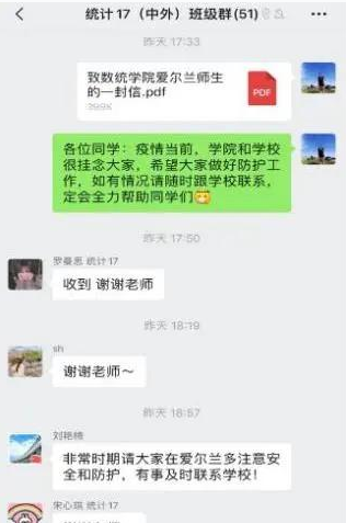 遠赴重洋求學的64名學子,雖不在國內(nèi),但他們?nèi)耘f被數(shù)學與統(tǒng)計學院輔導員李鑫掛念。李老師主動通過微信、QQ等方式與他們保持“點對點”聯(lián)系,及時掌握學生動態(tài),確保信息上報無“死角”。他在海外學子最焦慮的時刻,用一條條疫情的通報、一句句暖心的問候、一串串溫暖的字符,疏導著焦慮,安撫著情緒,傳遞著信心。在了解到學生無法在愛爾蘭購買到防護口罩的情況后,李老師多方聯(lián)系,成功為學生配齊口罩并于近期寄往愛爾蘭,用實際行動守護學生的健康與安全。