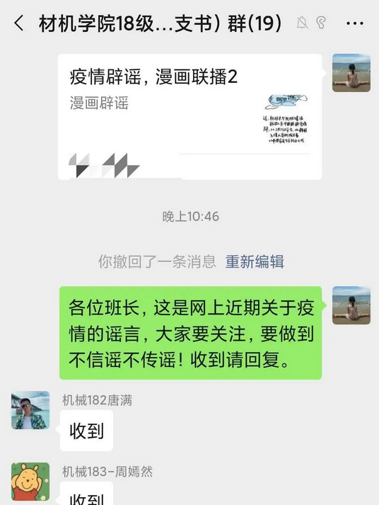 當“搶購雙黃連”、“喝酒抗病毒”、“環(huán)保酵素抑菌殺毒”等謠言不時出現(xiàn),材料與機械工程學院輔導員鄧浩為避免學生輕信上當,及時查閱資料,收集官方信息,不間斷在朋友圈、微信群宣傳最新防控知識。同時,鄧老師動員團學骨干開展“粉碎抗疫謠言”工作,主動破除網(wǎng)絡謠言,引導學生不造謠、不信謠、不傳謠,做好一名抗“疫”網(wǎng)絡安全知識的宣傳員。
