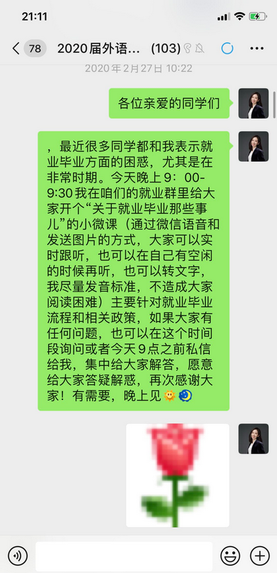 疫情當前,每名大四學生的就業(yè)都牽動著外國語學院輔導員張悅的心。她圍繞“云就業(yè)”開展工作。每天花費大量時間搜集招聘信息,將最優(yōu)質(zhì)的崗位招聘發(fā)給畢業(yè)生,鼓勵學生認真準備,以最良好的精神面貌迎接招聘單位。同時,張老師認真開展就業(yè)指導,細心解答同學們最關注的考研復試、出國留學、自主創(chuàng)業(yè)等問題,為學生一對一辦理就業(yè)生推薦表、三方協(xié)議等就業(yè)手續(xù)。