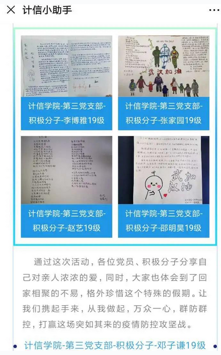 計算機與信息工程學院輔導員李文靜充分調(diào)動學生黨員活力,組織本科生黨支部深入學習習近平總書記關于疫情防控工作系列重要講話和指示精神,組織豐富多彩的黨員活動,如“致武漢同學的一封信”、“黨員陪你讀書”、“身宅心不宅”系列活動等。特別值得一提的是,李老師帶領黨支部成員以“共抗疫情、愛國力行”為主題,共同回顧2003年抗擊非典和本次抗擊新冠病毒的感人故事,深入愛國育人價值,引導學生用歷史的眼光,理性看待疫情,激發(fā)學生的愛國情懷,以及為國家發(fā)展貢獻力量的動力和決心。