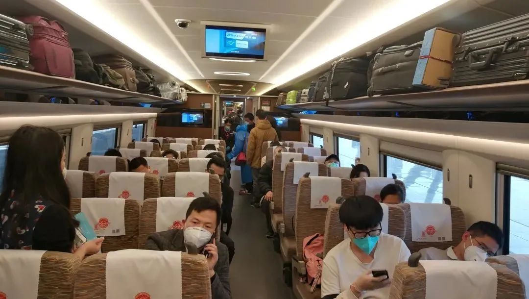 測量體溫,出示健康碼,核驗名單……經過一系列程序后,我們登上了回京的火車。與以往“春運”返程相比,專列乘客以中青年為主,車廂內的人員密度也低了一些,乘務員會分時段給乘客測量體溫。本著對自己和國家負責的態度,我一路上沒摘過口罩,沒有吃飯和喝水。