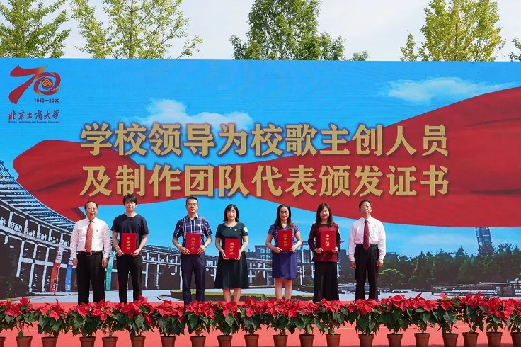 北京工商大學黨委書記黃先開(左一)、校長孫寶國(右一)為校歌主創人員及制作團隊代表頒發證書(學校供圖)