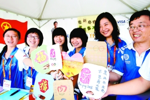 昨天,北京工商大學嘉華學院奧運城市志愿者展示自制的“奧運扇”。這批畫有中國印、奧運五環(huán)等奧運元素的扇子,是志愿者們利用廢紙板制成。 本報記者 吳鏑攝