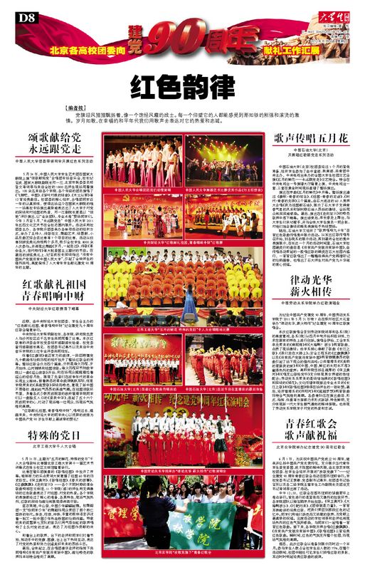 比賽在管樂團演奏的《歌唱祖國》中拉開了序幕。鏗鏘有力的樂點帶領大家重溫了祖國60年的歷史巨變。《保衛黃河》、《歌唱祖國》、《春天的故事》、《紅旗飄飄》、《走向復興》……各個不同時期的革命歌曲響徹在文體館,11個學院(部)的師生用充滿激情的紅色歌曲表達了對祖國、對黨的熱愛。各個學院的表演都經過了精心的準備,各具特色,現場氣氛熱烈,紅歌的深情與雄壯被展現得淋漓盡致。