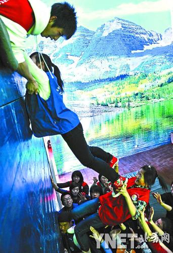 通常在室外的心理擴展訓練設施被北京工商大學搬進了室內。在這間380平方米的訓練館里,高空、低空和地面錯落有致地分布著不同訓練目的的設施:極限攀巖、逃生墻、步步登高、求生艙與逃生艙、浮云橋、高空獨木橋等。昨天上午,商學院幾個不同專業班級的同學在“逃生墻”上上了一堂心理健康課。20多人要齊心協力,想辦法逐一攀上近4米高的墻頭。在困難面前,原本彼此還不太熟悉的同學們分工合作,很快有了兄弟姐妹的感情,連平時最內向、沉默的女生此時都紅著臉、高舉雙手幫著托舉同學。拓展課結束后,滿身大汗的同學們都是彼此搭著肩膀走出訓練館的。
