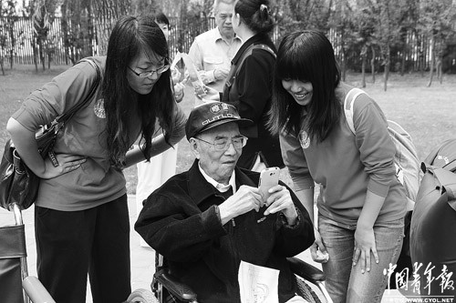 519日,來自北京工商大學經濟學院的青年志愿者讓87歲的老華僑邵彤欣賞踏青時拍的照片。