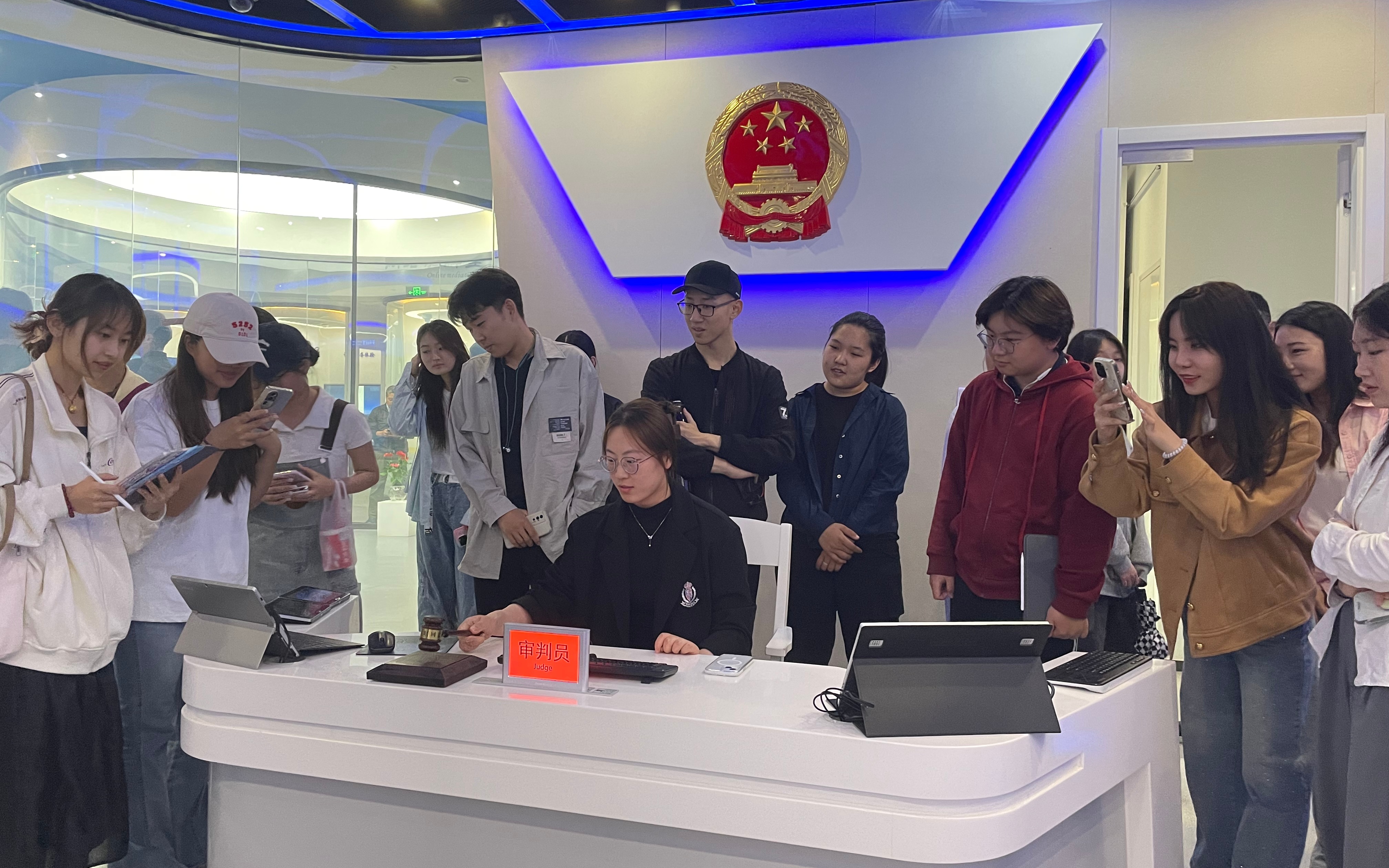在北京互聯(lián)網(wǎng)法院的在線訴訟體驗(yàn)區(qū),同學(xué)們參觀了解了互聯(lián)網(wǎng)法院的全流程在線訴訟模式。網(wǎng)絡(luò)法庭體驗(yàn)廳中,原告和被告的實(shí)時(shí)影像出現(xiàn)在審判員席面前的左右屏幕上,模擬真實(shí)的法庭場景。當(dāng)事人雙方不需要來到現(xiàn)場,即可完成司法流程。兩所學(xué)校的同學(xué)們輪流體驗(yàn)坐在審判員的位置上,手握法槌,感受科技力量加持下的法庭尊嚴(yán)。