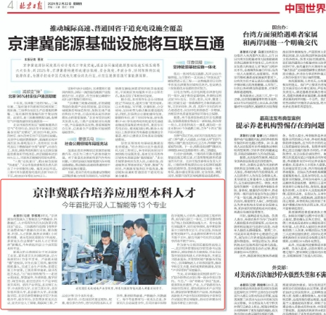 《北京日報》2月22日第四版刊發文章《京津冀聯合培養應用型本科人才,今年首批開設人工智能等13個專業》,對我校成為“京津冀協同發展人工智能助力產教融合、科教融匯、人才培養的先行先試改革示范園區”首批簽約高校進行了報道,現將全文轉載如下: