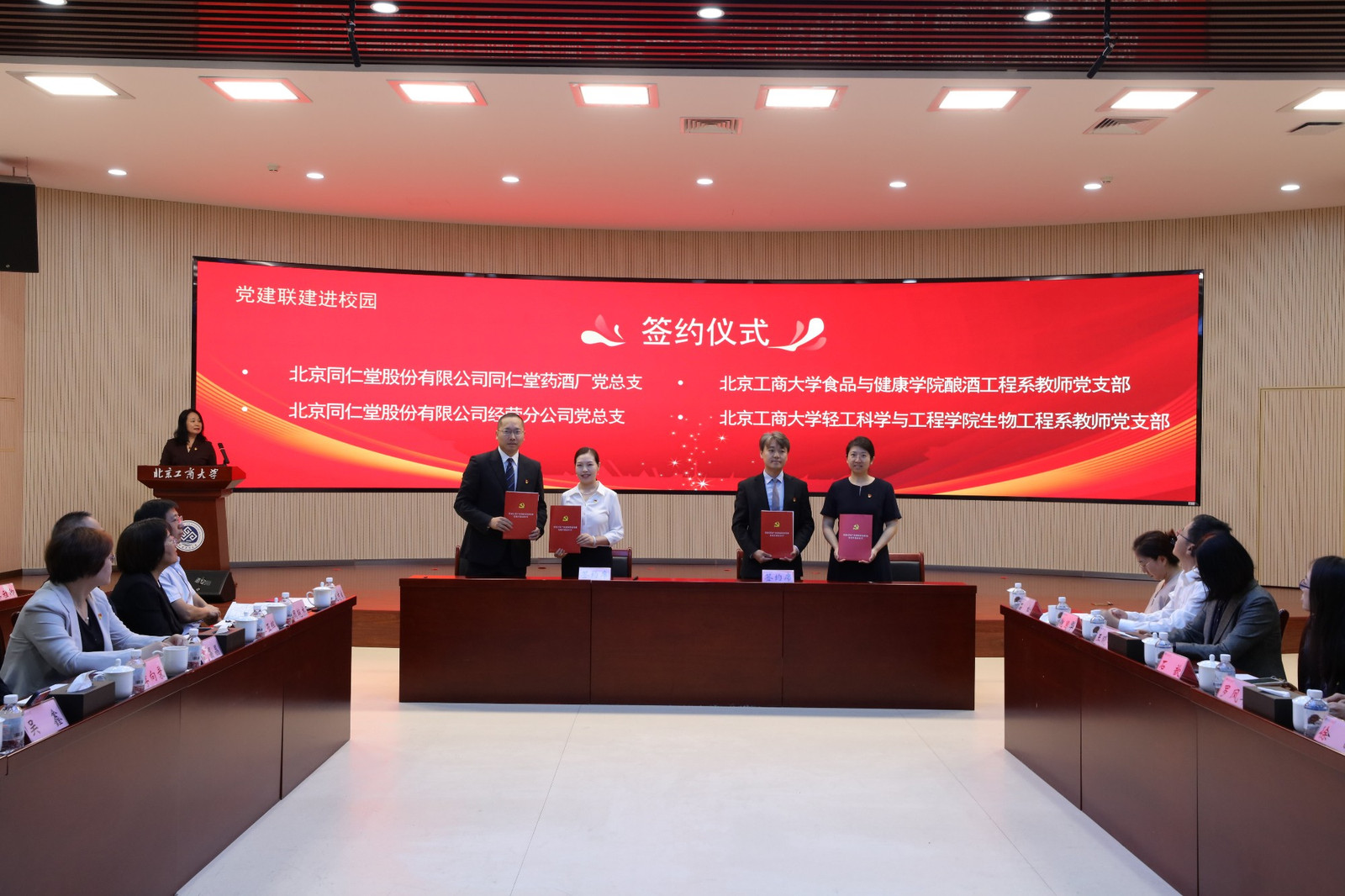 會上舉行黨建共建協議簽約儀式。經前期深度對接,學校食品與健康學院、設計與藝術學院、釀酒工程系、生物工程系、廣告系、應用統計系、食品營養與健康系、食品科學與工程系、食品質量與安全系等9個院系黨組織,分別與北京同仁堂健康藥業股份有限公司黨委、北京同仁堂股份有限公司同仁堂藥酒廠黨總支、北京同仁堂股份有限公司經營分公司黨總支、北京同仁堂世紀廣告有限公司黨支部、北京工美集團有限責任公司王府井工美大廈黨總支、北京農商銀行房山支行長陽支行地區黨支部、北京一輕研究院有限公司第三黨支部、北京一輕食品集團有限公司黨總支、北京北冰洋食品有限公司科室黨支部等9家企業黨組織達成共建意向。
