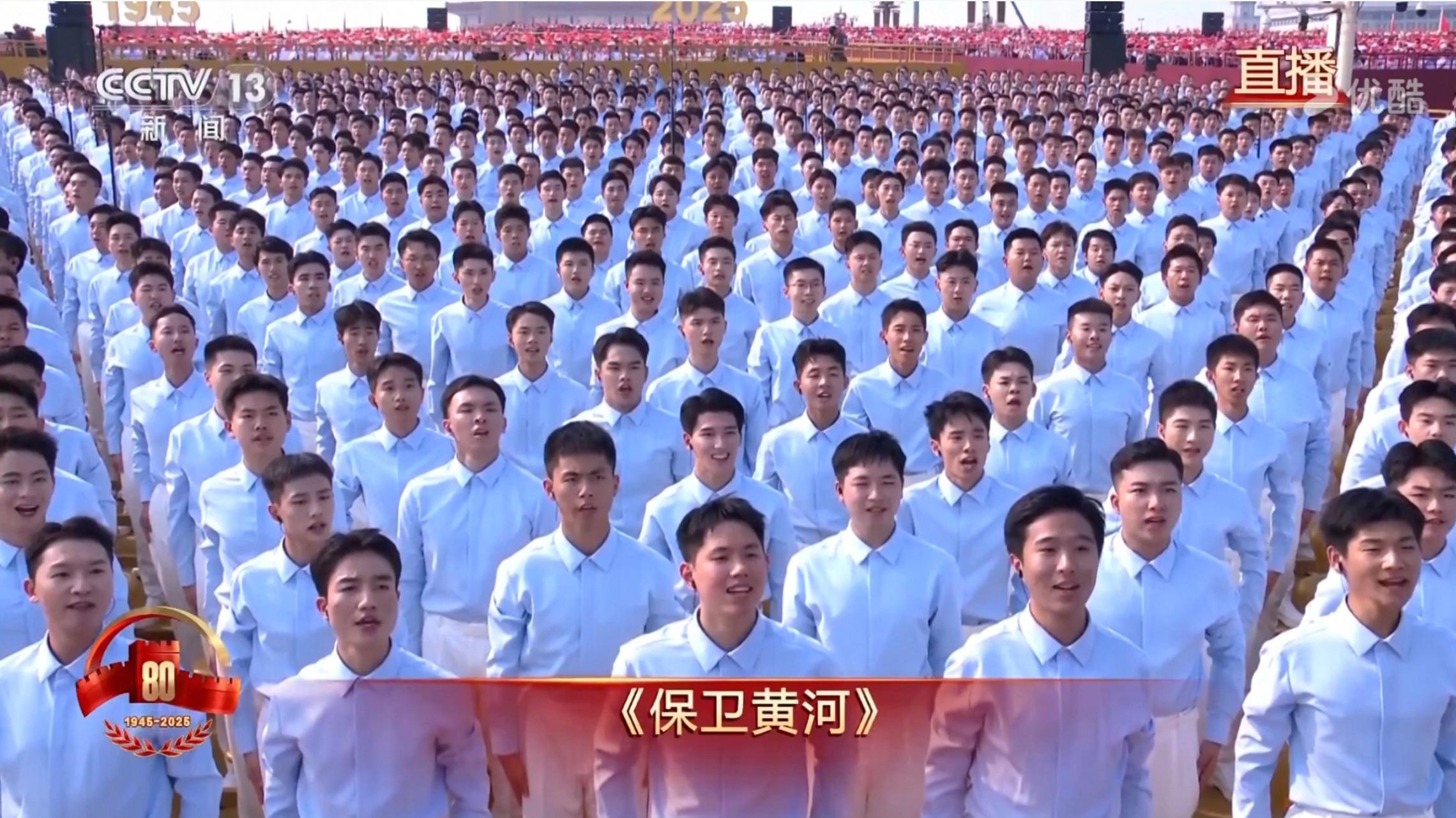 歌聲嘹亮,廣場合唱團拉開序幕。由首都40所高校3000人組成的廣場合唱團作為紀(jì)念活動的重要組成部分,與聯(lián)合軍樂團一起,奏唱《松花江上》《在太行山上》《保衛(wèi)黃河》等經(jīng)典抗戰(zhàn)歌曲,歌聲與銅管齊鳴,形成排山倒海的氣勢,他們在歌聲中唱出了中華民族的“精神密碼”,誰膽敢侵犯我們,就會在這鋼鐵長城面前碰得頭破血流!現(xiàn)場仿佛能聽見平型關(guān)大捷的槍聲、百團大戰(zhàn)的沖鋒號,形成氣吞山河的“青春最強音” 。