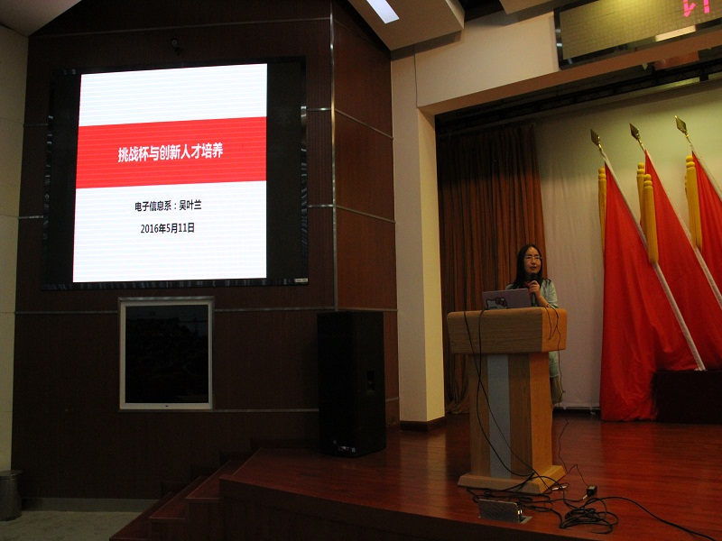 電子信息系吳葉蘭老師作為學(xué)院指導(dǎo)教師代表和大家交流了指導(dǎo)學(xué)生參加“挑戰(zhàn)杯”比賽的經(jīng)驗體會。