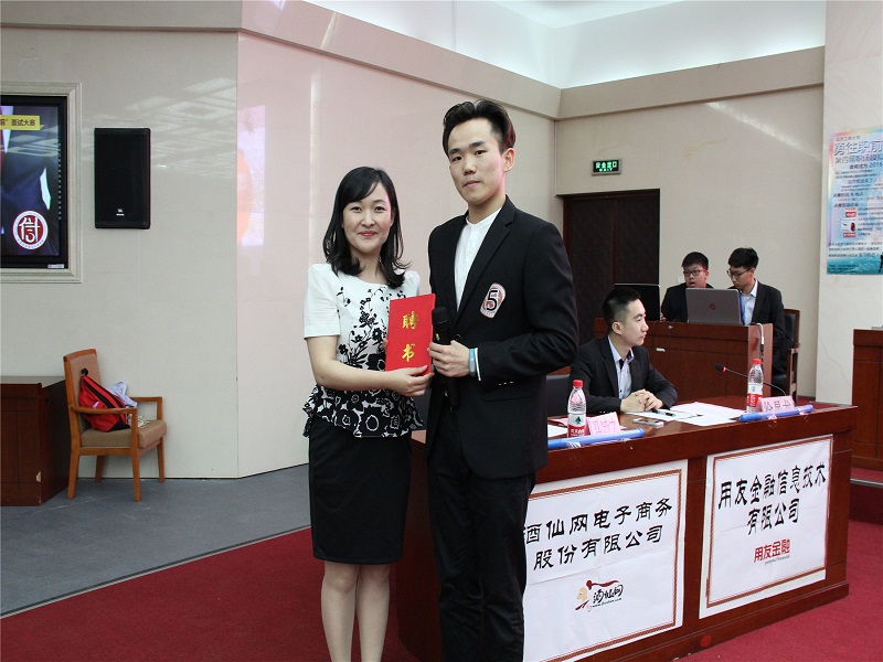 本次大賽邀請(qǐng)了用友金融信息技術(shù)有限公司、酒仙網(wǎng)電子商務(wù)股份有限公司、北京彼速信息技術(shù)有限公司、娘家教育科技(北京)有限公司等企業(yè)的高管擔(dān)任現(xiàn)場(chǎng)評(píng)委。經(jīng)過(guò)前期復(fù)賽的激烈角逐,共來(lái)自全校各學(xué)院的10名選手脫穎而出進(jìn)入決賽。決賽選手逐一登臺(tái)展示,評(píng)委用亮滅燈形式?jīng)Q定,留燈選手由企業(yè)直接提供實(shí)習(xí)/招聘崗位,當(dāng)場(chǎng)簽約。