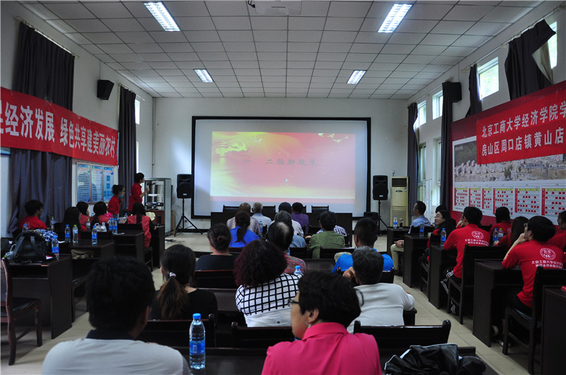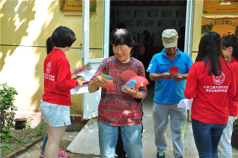 今年是經(jīng)濟學院學生黨支部與黃山店村黨支部第四年開展共建活動,學生支部以“創(chuàng)新協(xié)調(diào)促經(jīng)濟發(fā)展,綠色共享建美麗新村”為主題開展宣講活動,學生黨員從二胎政策和農(nóng)村生態(tài)環(huán)境保護兩方面向村民進行民生政策普及。此外,學生黨支部邀請了學校紅十字會的學生代表,向村民們講解日常急救常識,并利用假人演示心肺復蘇、繃帶包扎等流程。黨委副書記杜亞輝向黃山店村授予“北京工商大學紅十字會志愿者服務站”的牌匾,在日后的服務過程中,學生黨員將為游客提供微型救助服務。