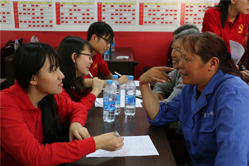 在“獻計獻策”座談會環(huán)節(jié),學生黨員們積極發(fā)言,黃山店村民向學生黨員這些年來提供的服務表示感謝,14級學生黨員胡欣怡、馮飛龍也對黃山村的發(fā)展表述了自己的意見和建議,其中將景區(qū)照片制作明信片擴大宣傳、景區(qū)周邊攤位價格彈性化、建立黃山店村特色商業(yè)區(qū)等想法受到了村民們的認可。隨后,學生黨員們將事先準備好的“精準扶貧”的相關問題在村民中展開調(diào)研,結合專業(yè)知識,與村民展開熱烈交流。