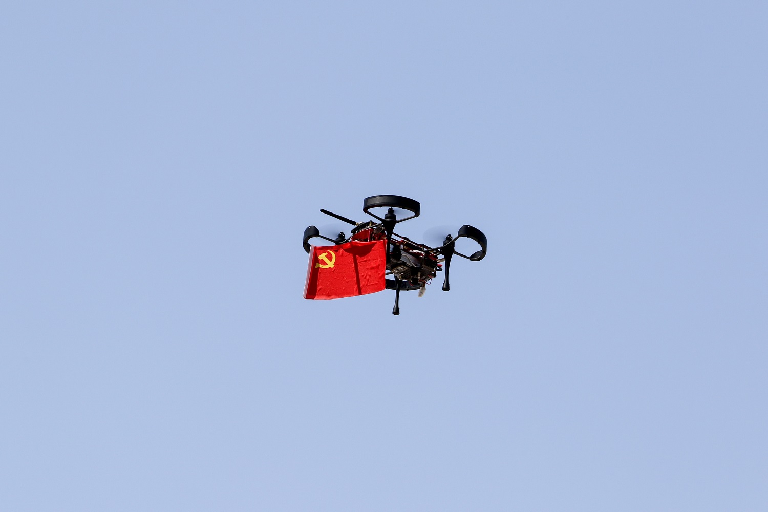 此刻,人工智能學院研發的機器人“小AI”也舉起了自己的右手,用智能語音正說著“我志愿加入中國共產黨”;同時,懸掛著黨旗的無人機編隊從人群中緩緩起飛,翱翔天空,與同學們一起向黨的百年華誕致敬。大家抬頭注視著,揮動著黨旗高喊“祝偉大的中國共產黨生日快樂”,快閃活動在同學們的歡呼聲中圓滿結束。