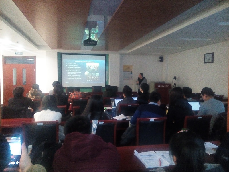 Luc Renambot教授由電影《星球大戰》講起,介紹了其所在的電子可視化實驗室在可視化與虛擬現實方面的研究,介紹了三代虛擬現實設備以及三代可視化設備,包括CAVE, StarCAVECAVE2,以及大數據時代下的可視分析方法,處理大規模數據的有效措施,并通過圖片和視頻向大家展示絢麗的可視化交互效果和虛擬現實技術。引起現場聽眾的濃厚興趣。Luc教授的講解詳細生動,現場氛圍十分活躍。
