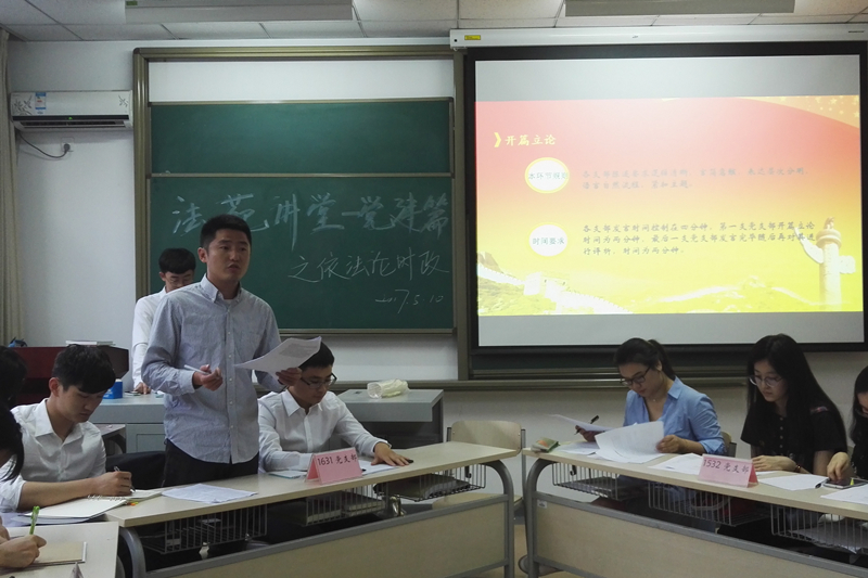 為推進(jìn)“兩學(xué)一做”學(xué)習(xí)教育常態(tài)化制度化,發(fā)揮黨員的先鋒作用,法學(xué)院黨員工作站于5月10日在阜成路校區(qū)舉辦“法苑講堂——黨建篇之依法論時政”活動,本次活動以如何看待“網(wǎng)貸進(jìn)校園”現(xiàn)象為題展開討論,各黨支部積極響應(yīng),紛紛派出了優(yōu)秀的代表隊(duì),活動特別邀請輔導(dǎo)員段晨明、崔東陽、董玫、高天劉云作為本次活動的評委。