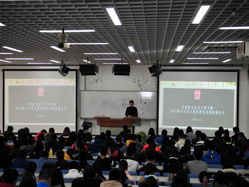 12月21日,計算機與信息工程學院在良鄉(xiāng)校區(qū)舉辦2017級學生入學百天教育暨青春榜樣報告會。計信學院黨委副書記楊立功、團委書記曹璐婷、16級輔導員李玉嫻、17級輔導員張燁、李文靜以及2017級計信學院全體學生參加了本次大會。大會由2017級學生盧哲主持。