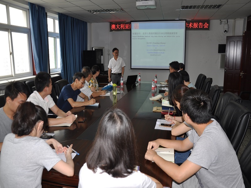 6月25日,澳大利亞維多利亞大學應用信息科學研究中心主任、復旦大學社會計算及電子健康實驗室主任張彥春教授,應邀到我校做了題為“智慧醫(yī)療-醫(yī)學大數(shù)據(jù)挖掘及生命全周期健康管理”的學術報告。北京郵電大學計算機應用技術中心主任、中國人工智能學會常務理事 、中國人工智能學會智能服務專業(yè)委員會主任杜軍平教授,我校計信學院院長蔡強教授、網(wǎng)絡中心主任李海生教授等30余名師生參加了報告會。報告會由計信學院黨委書記、食品安全大數(shù)據(jù)技術北京市重點實驗室主任陳誼教授主持。