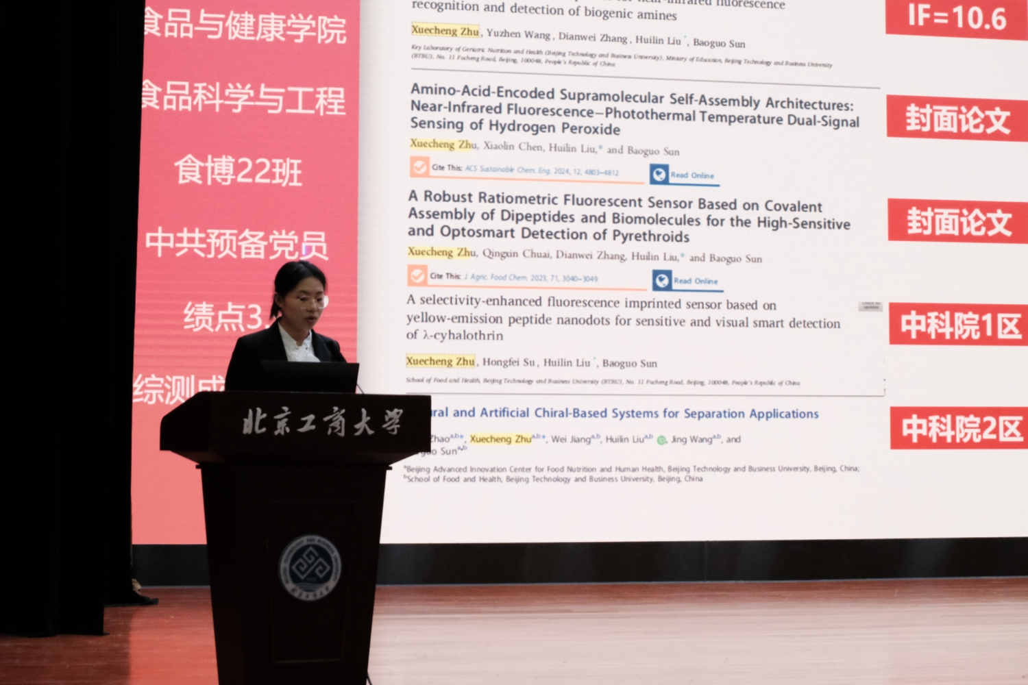 按照“公平、公正、公開、擇優”的原則,答辯分為博士組、學碩組和專碩組三個類別依次進行。共有30名候選人參與答辯,包括博士研究生9人、學術型碩士8人、專業型碩士13人。在限時3分鐘的陳述中,候選人圍繞思想品德、學業成績、科研與實踐成果、發展潛力等方面展開匯報。在緊張而有序的答辯會上,優秀學子們盡展風采,他們圍繞學業成績、科研創新與社會實踐等多個維度,全面而精煉地匯報了自己在過去一學年中的成長與收獲。在學業方面,候選人們展現了扎實的專業功底,多位同學學業成績名列前茅;在科研領域,李忍同學自入學以來,以第一作者身份累計發表SCI論文9篇,全部為中國科學院TOP期刊論文,其中3篇影響因子超過10,1篇入選高被引論文;獲得授權發明專利1項,參編學術著作1部,該著作已被隆平水稻博物館永久收藏;同時,擔任Journal of Cereal Science、Natural Product Communications和Applied Food Research等多個國際期刊的審稿人。在學科競賽方面,孫璐瑤同學作為核心研發人員及答辯成員在第十九屆“挑戰杯”全國大學生課外學術科技作品競賽“揭榜掛帥”專項賽中獲國家級特等獎及項目擂主;在“互聯網+”“青創北京”“京彩大創”等各類競賽中均榮獲省市級以上獎項。在社會實踐與綜合素質方面,多位候選人分享了在學生工作、志愿服務、社會調研、企業實習等方面的豐富經歷,展現了新時代研究生知行合一、擔當奉獻的全面素養。