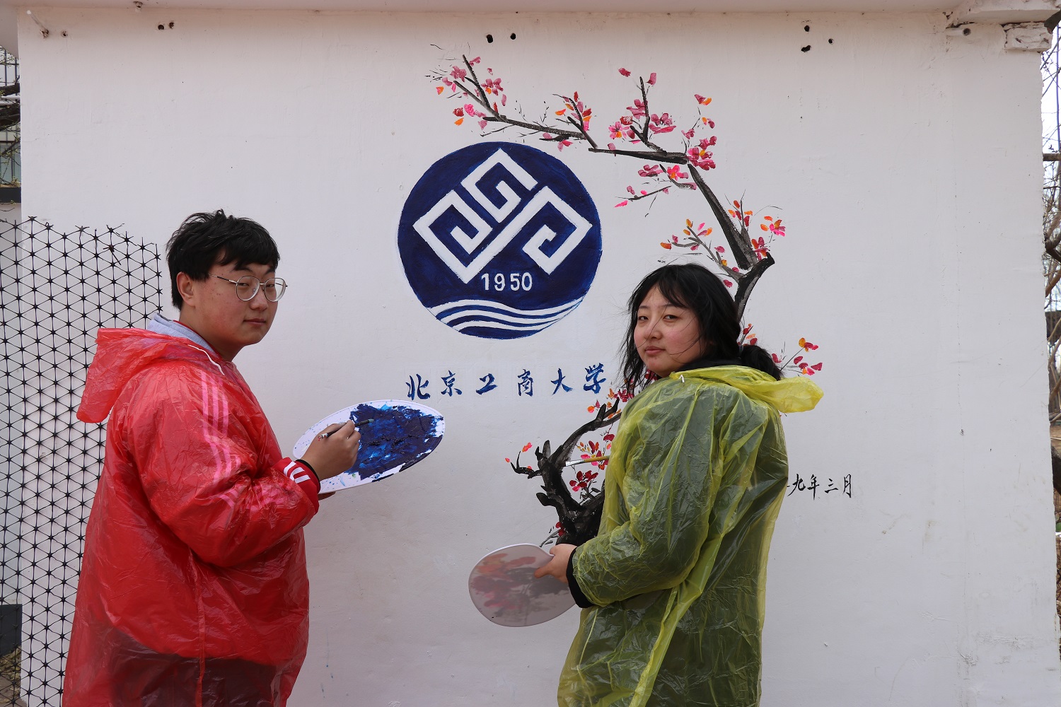 蘸滿藍(lán)色顏料的筆刷,為畫中的藍(lán)天涂上了最后一筆。北京工商大學(xué)深藍(lán)色的?;张c畫中的綠水青山融為一體??v使風(fēng)沙再大,同學(xué)們的手上、衣服上、甚至頭發(fā)上都沾上了各種顏色的顏料,但他們看向“重獲新生”的文化墻、看向彎腰清洗筆刷的徐亮老師、看向認(rèn)真欣賞墻繪的村民們,內(nèi)心更多的是成就感。