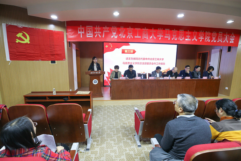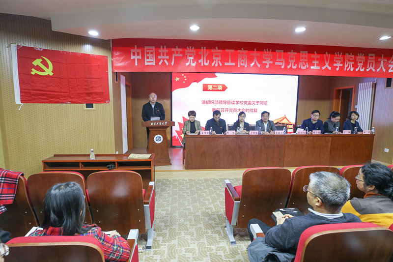 大會在莊嚴的國歌聲中拉開帷幕。張國龍宣讀了學校黨委《關于同意中共北京工商大學馬克思主義學院召開黨員大會的批復》。