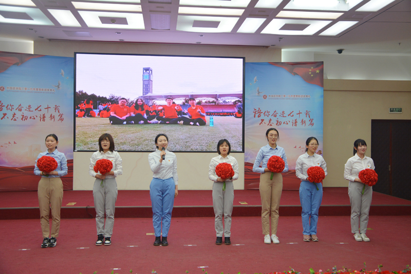 在表演環節中,情景表演《青春,為什么是紅色的》真實再現學院19名師生黨員參加國慶70周年群眾游行33號“從嚴治黨”方陣的點滴故事,以黨員的初心使命書寫無悔的紅色青春。舞蹈《芳華》以優美抒情的舞姿,向新中國不同時代的奮斗青春致敬。節目《我們的初心》以視頻采訪與師生朗誦的形式,通過英語、西語、法語、漢語等不同語言表達外語教師培育外語人才的初心,為國育才的使命,從學生黨員、志愿者、普通學生的視角講述每一個外語學子的初心故事。