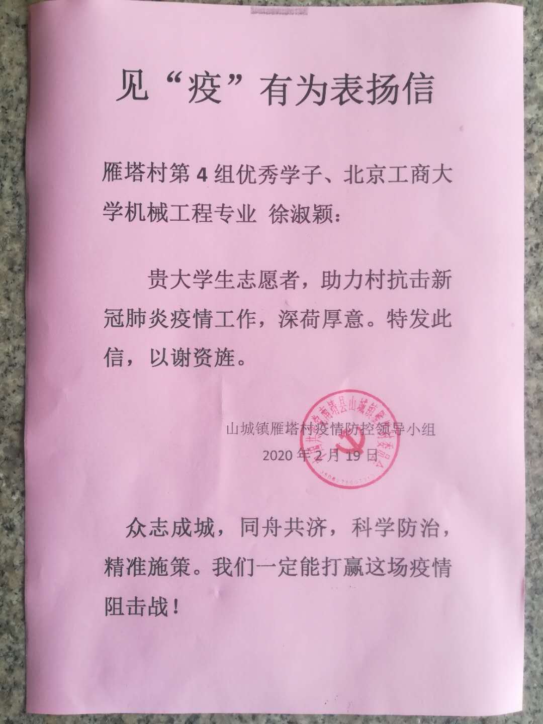 近日,材機學院機械192班徐淑穎同學收到了來自福建省南靖縣山城鎮雁塔村的見“疫”有為表揚信,以感謝徐淑穎同學自愿擔任志愿者,助力鄉村抗擊新冠肺炎疫情的工作。