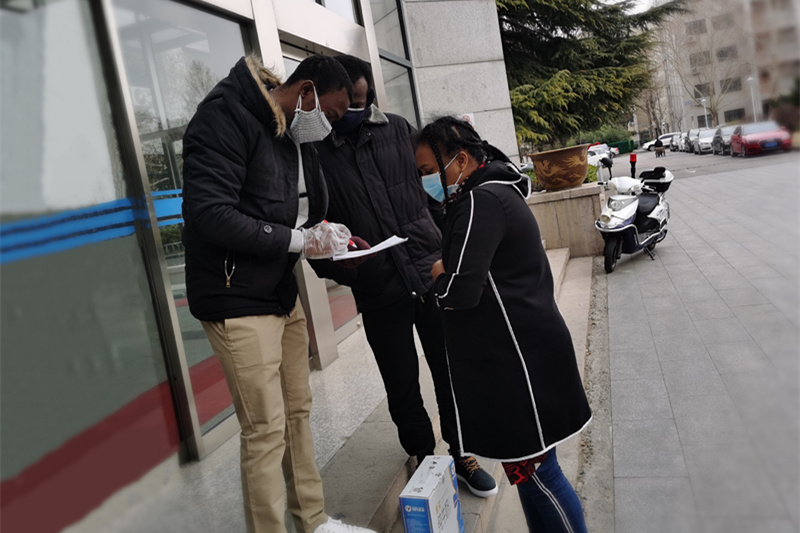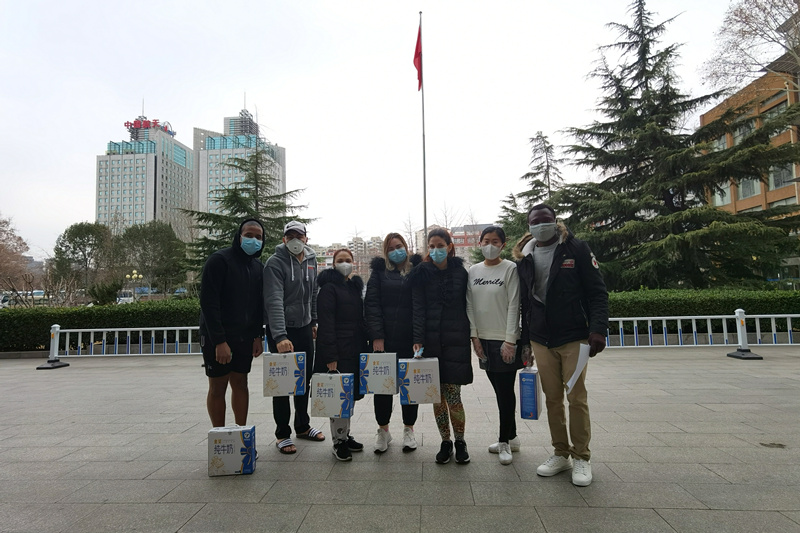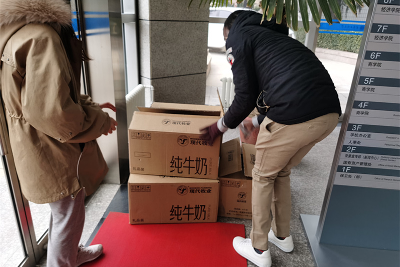 MBA學子工作后又重返校園,心懷感恩與責任,他們在MBA聯合會的組織下為每位留校學子捐贈一箱牛奶以及各類零食。由于疫情防控需要,他們不能返校,由MBA聯合會指導老師孫碩代為捐贈。為防止學生聚集扎堆,采取室外發放,錯開通知、分散領取的方式。西區留校同學在綜合樓外分批領取,東區留校同學在東區南門外分批領取。發放老師佩戴一次性口罩和手套,所有領取同學佩戴口罩并配合保衛處抽查體溫。來自利比里亞的留學生JACKSON主動幫老師搬箱子拉小推車,頭上冒汗卻表示自己“not tired”。來自新疆的維吾爾族同學帕孜來提表示,自己已經大四了,正在網上實習,有了學院的補給,更有動力了。等在東區的留學生遠遠看到老師拉著牛奶的小推車過來,一起用英文喊:“Thank you, China!
