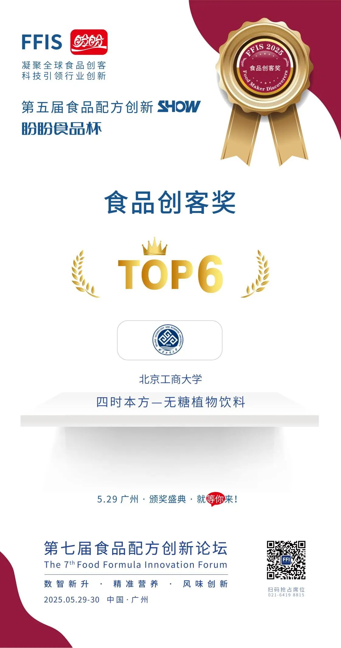 近日,在食品界備受矚目的第五屆食品配方創新SHOW(FFIS)上,北京工商大學食品與健康學院師生團隊憑借其匠心獨運的創新產品——“四時本方—無糖植物飲料”,從眾多參賽作品中脫穎而出,榮獲“盼盼食品杯·食品創客獎TOP6”。這一獎項是成品組的最高榮譽,不僅是對我校師生在食品科技創新領域不懈努力的肯定,更是對我校食品學科綜合實力和人才培養質量的有力證明。
