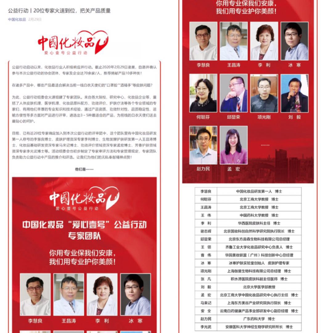 2020年2月25日,為積極貫徹和落實習近平總書記就關心愛護參與疫情防控工作的醫務人員的重要指示,由《中國化妝品》雜志社牽頭啟動“致敬最美白衣天使·中國化妝品‘愛心壹號’公益行動”,我校理學院化妝品系教授何聰芬、孟宏、王昌濤、賈焱加入本次公益行動組委會專家團隊,作為業界專家助力公益行動中優質產品的評選。