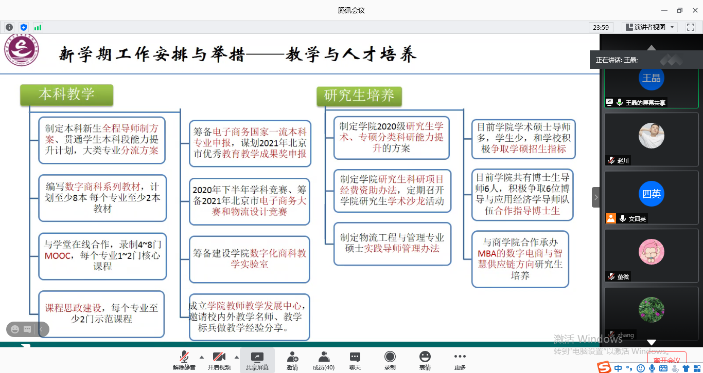 副院長王晶就分管的本科生和研究生工作進行了總結,上半年學院圓滿完成抗擊疫情期間的線上教學任務,修訂學院四個本科、三個研究生專業的培養方案修訂,在學校教學名師標兵、教改立項、學科競賽等方面取得了優異的成績,成功舉辦了研究生夏令營活動。詳細布置了下半年的工作,下半年學院將圍繞學校重點工作積極準備電子商務一流本科專業申報,制定學院本科生全程導師制方案,籌備數字商科系列教材,推進精品課程MOOC建設、加強研究生創新能力培養等相關工作,全面提升本科與研究生培養的質量。