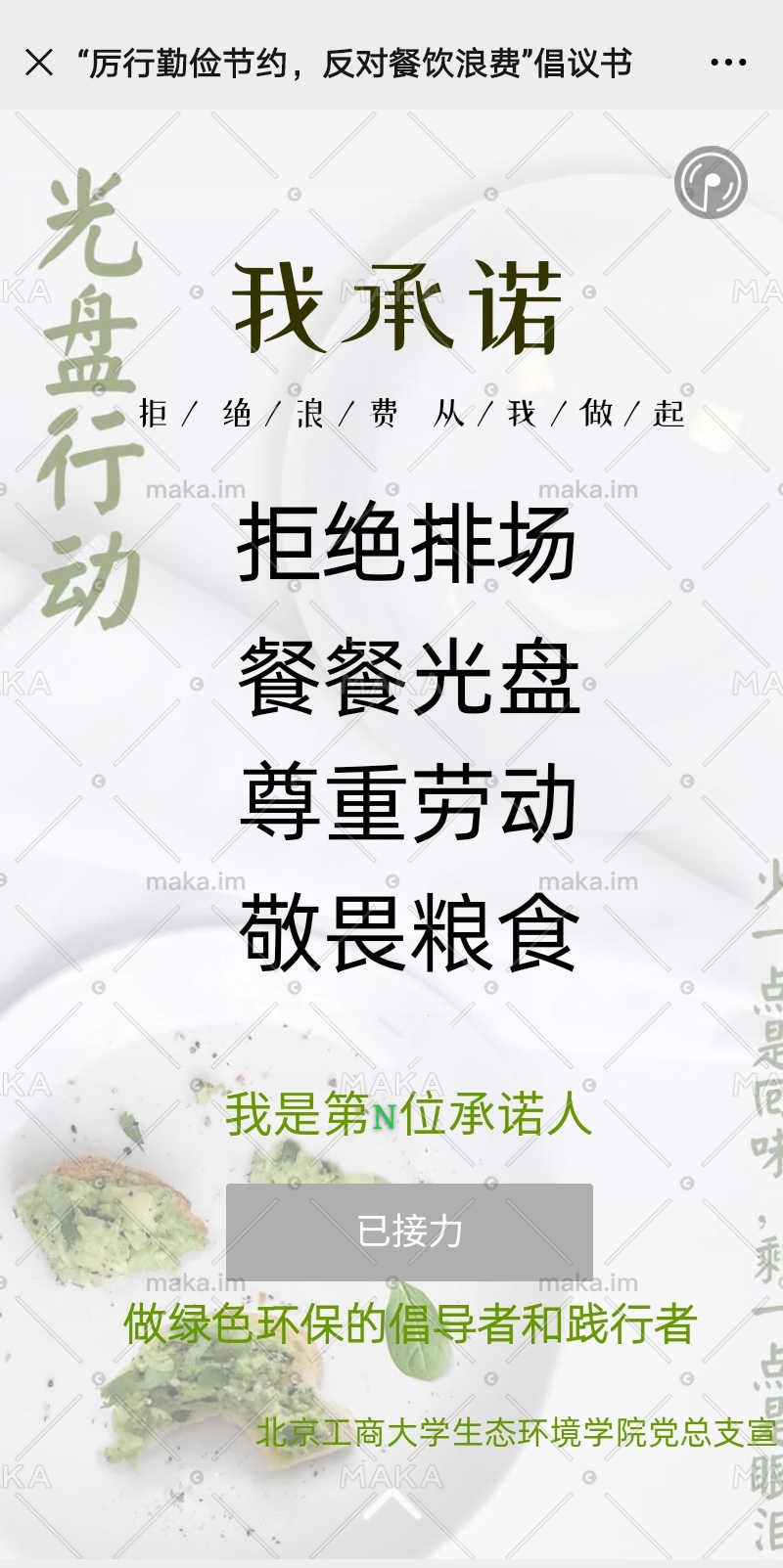 “一粥一飯當(dāng)思來之不易,半絲半縷恒念物力維艱”,通過主題班會的學(xué)習(xí)和討論,同學(xué)們增強(qiáng)了作為當(dāng)代環(huán)境工程專業(yè)的大學(xué)生的責(zé)任感和使命感,紛紛表達(dá)了務(wù)必要遵從國家指示的決心,提倡并帶頭踐行勤儉節(jié)約的優(yōu)秀美德,做新時代合格的大學(xué)生。