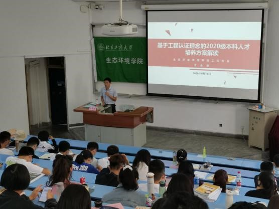 環境工程系系主任王永京副教授為同學們講授以工程認證為指導的培養方案,王永京副教授向同學們介紹了環境工程專業的培養目標即旨在培養具有扎實的環境工程的專業知識和工程實踐技能的環境領域高級技術人才,講解了課程目標、評價指標和畢業要求等,使同學們對于培養方案有了更加明晰的理解。