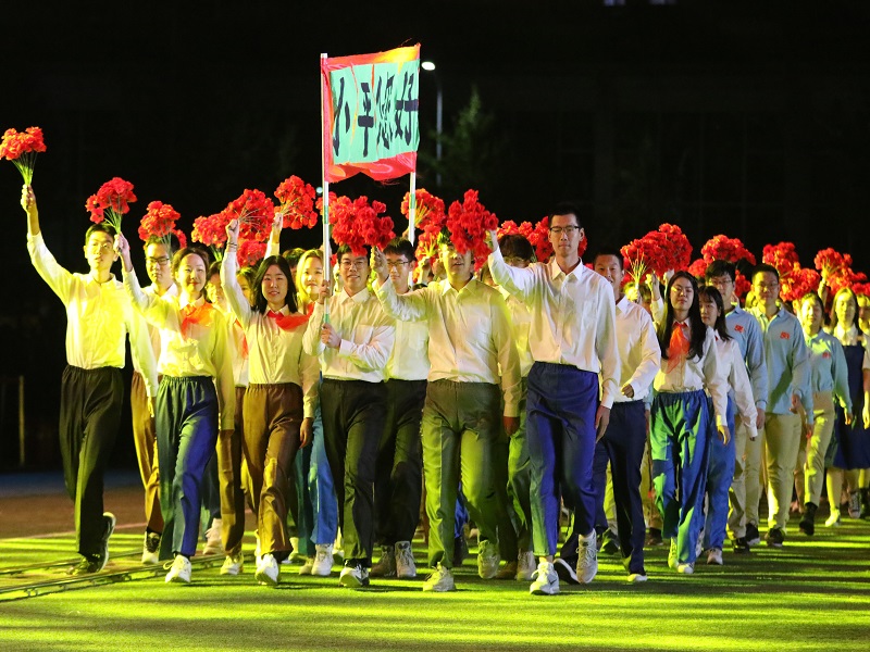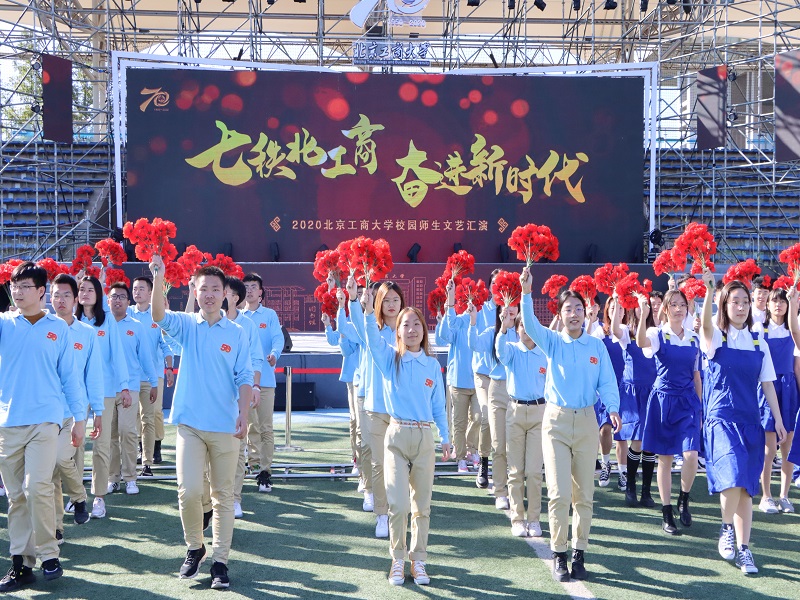 彩旗飄揚、流光溢彩,觀眾們聽朗誦者細述那些年國慶聯(lián)歡時的難忘故事,傳頌著振奮人心的佳話。伴著樂曲,歷史的畫卷徐徐展開,人工智能學院的一百名同學身著時代特色衣裝,熱情洋溢、氣宇軒昂地走過操場,代表參加35周年、50周年、60周年、70周年國慶群眾游行的北工商人,重現(xiàn)國慶聯(lián)歡時熱情歡樂的游行場景,用前進的腳步敘說七十風霜,用無言的行動彰顯愛國赤心。