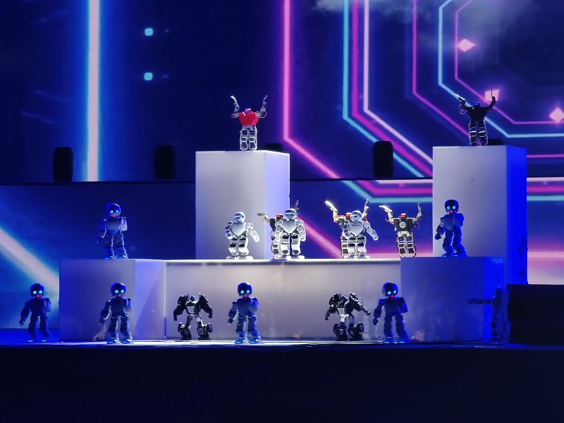 炫酷時尚的音樂響起,人工智能學院研發(fā)的機器人精彩亮相,在舞臺上與街舞社同學們一起動感熱舞。絢麗華美的燈光,動感昂揚的樂音,交織為初春細流,淌過人們的心間;又如奔騰東往的磅礴川流,載著北工商人對未來科技化時代的無限展望,氣勢浩蕩涌向未來。與此同時,多架無人機在夜空中拼湊出“70”“BTBU”等愛意滿滿的圖案,引起現(xiàn)場觀眾陣陣歡呼。主持人對舞蹈小領隊機器人“小北”進行采訪,感謝它與它的朋友們?yōu)槲覀兊哪感愍氁粺o二的生日禮物。小北語言幽默,模樣可愛,贏得在場各位的歡心。最后,小北為母校歡唱生日快樂歌,為這個夜晚增添了獨特的意義。學院演出任務圓滿完成!