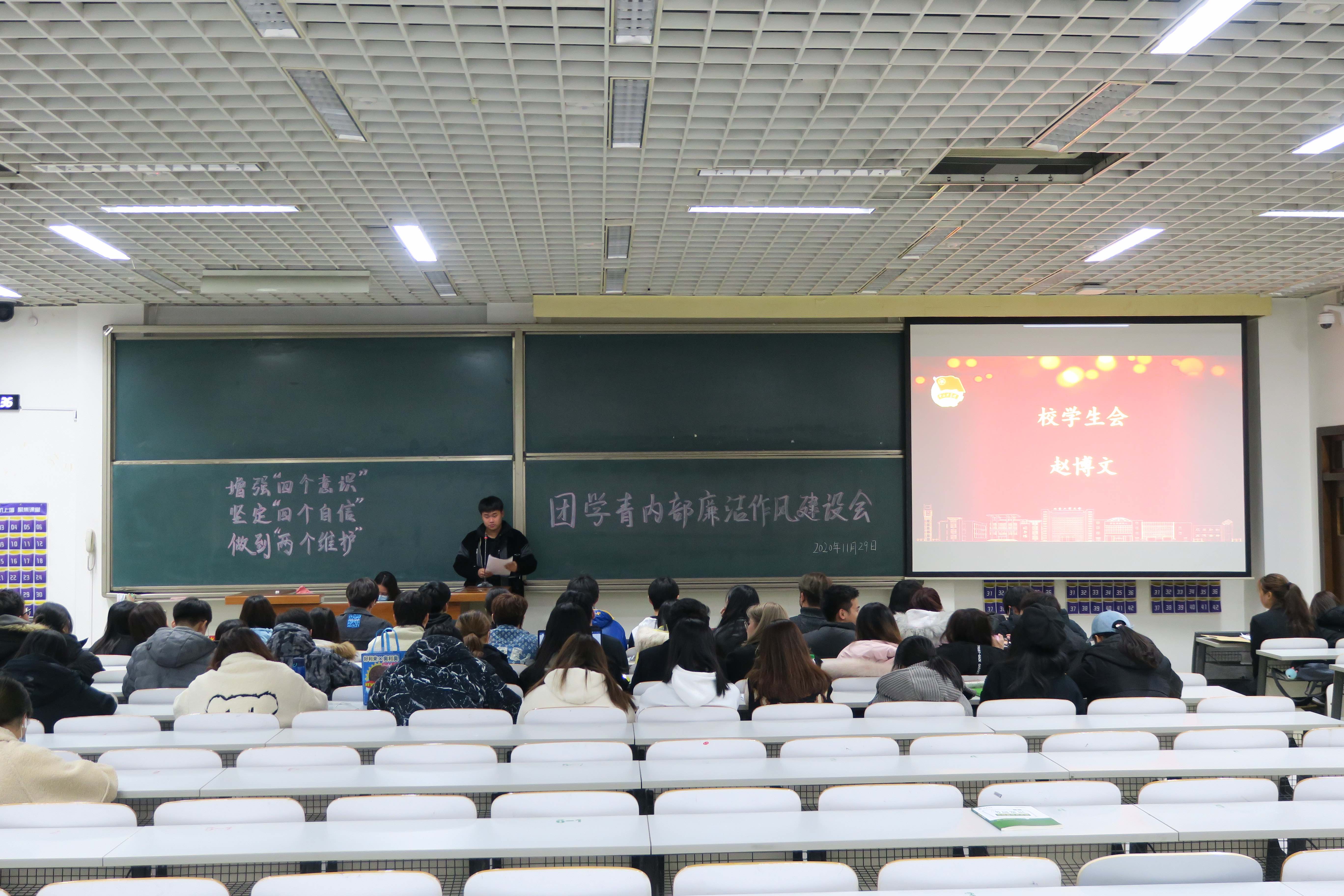 11月29日晚,我校團委學生組織廉潔作風建設會在良鄉(xiāng)校區(qū)舉行。校團委老師、團委學生各部門、學生會、青年志愿者協(xié)會主要學生干部共四十余名成員參加了本次會議。