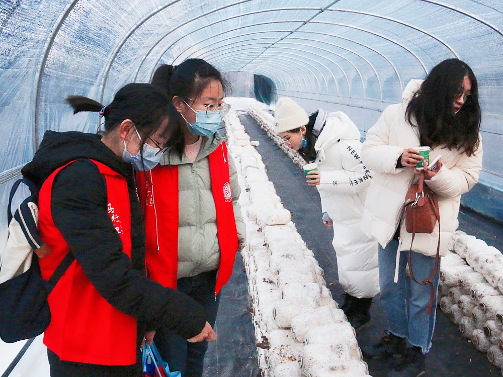 隨后,劉文彬帶領師生參觀了村容村貌和低收入產業基地。二站村曾是依托磚廠繁榮的“富裕村”,遵循生態文明建設要求關閉了磚廠,在村委帶領下,全村找準產業轉型升級方向,興辦“種桑養桑”為核心的桑葉茶生產基地,目前已初見成效。同學們參觀了桑葉茶和速凍食品生產車間、菌菇大棚,了解了茶葉種植、生產和由此帶動的菌菇種植、速凍食品產業。廠長熱情地講解演示,并邀請同學們品茶,大家體會到保護綠水青山、抓好生態文明建設、實現人與自然和諧統一對于振興鄉村的重要意義。二站村近些年的基礎設施建設成效也讓同學們感受到貫徹“以人民為中心”發展思想、做好民生工程的深刻內涵。