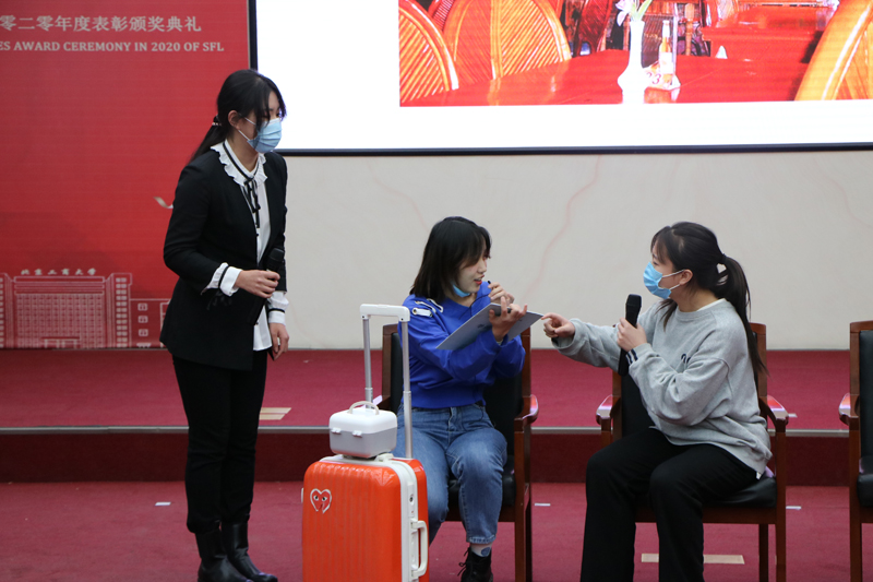 于濤宣讀《外國語學(xué)院2019-2020學(xué)年表彰決定》。在觀看優(yōu)秀學(xué)生風(fēng)采展示視頻后,許峰為國家獎學(xué)金、國家勵志獎學(xué)金、市級優(yōu)秀基層組織、黨員先鋒等獎項頒獎。苗天順、關(guān)濤、史巖林、王曉慶、王景云分別為優(yōu)秀學(xué)生獎學(xué)金、三好學(xué)生、優(yōu)秀學(xué)生干部、校友獎學(xué)金、疫情防控優(yōu)秀聯(lián)系人等獎項頒獎。