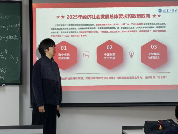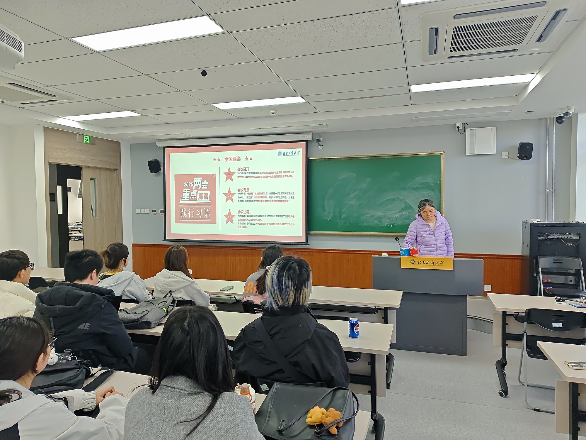 在兩會精神學習篇,班主任帶領各班學生,結合政府工作報告中的“制造強國”“教育強國”“人工智能+”等關鍵詞,向同學們解讀了2025年全國兩會精神。經濟學院、商學院與數字書院各班聚焦兩會提出的高質量發展與新質生產力,引導學生關注國家經濟布局,深入思考未來發展方向。輕工科學與工程學院各班圍繞“制造強國”戰略,鼓勵同學們主動探究如何以專業能力服務國家戰略需求。法學院、食品與健康學院、計算機與人工智能學院各班分別圍繞法治建設、健康中國與“人工智能+”等主題,通過分組討論和專題研討相結合,引導學生將個人未來發展與國家需求緊密結合。數學與統計學院各班重點學習了數字經濟和教育數字化,提高了學生對數字化轉型重要性的認識。語言與傳播學院各班深入探討了“人工智能+語言服務”的創新路徑和未來發展趨勢。設計與藝術學院圍繞鄉村振興與綠色發展主題,引導學生從兩會政策中把握時代方向,增強服務首都四個中心建設的主動性與責任感。