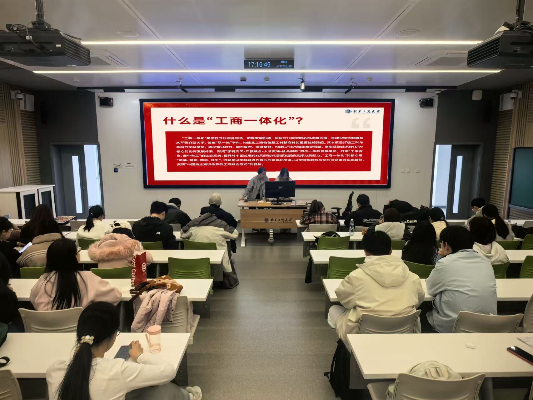 在“工商一體化”學習篇,班主任帶領學生簡要回顧了校史,引導學生認識到學校具有“工+商”的天然獨特優勢,為學生逐一介紹了“工商一體化”的內涵、目標、核心和必要性,并結合杰出校友和畢業生就業的經典案例,進一步引導學生深化對“工商一體化”的認識,增強學科交叉意識和創新精神,進一步強化了青年學子的使命擔當,將個人發展與學校事業、國家需求緊密結合起來,為學校“雙一流”學科創建和高水平研究型大學建設貢獻力量,在以中國式現代化全面推進中華民族偉大復興的篇章中書寫青春篇章。